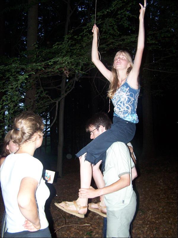 11.8. Ráno nás vzbudila… no mě to skrze zalepené, krátkozrakostí a astigmatismem stižené oči připadalo jako kombinace kocoura v botách s hloupým Honzou. A z rozhovoru jsem pochopila, že už máme být dávno na nohou a ať si teda jdem někam pro jídlo. Jelikož se tohoto úkolu chopili Honza s Evkou, ještě jsem využila příležitosti měkkého tepla spacáku a zdřímla si. Po druhém probuzení jsem se nějak nemohla dopočítat lidí. Bylo nás o Kubu a Jaňulu víc. Protože potřebovali posilu, odešla jsem se s nimi a vyrovnala tak naše počty. Putovali jsme dál přes kopce a lesy, až nás přepadla úžasná vodní příšerka a poradila nám jak dál. Po brození potokem a seznámení s převozníkem u lanového mostu jsme zapadli do bažiny, skrze kterou jsme se pročvachtali k mudrcovi a posléze alchymistovi. Ten nás poslal přes kopec, za kterým čekala Arnošta, která nás po peripetiích konečně pustila do království Širšejší. Posléze dorazily další skupinky, proběhly nějaké seznamky a pak Tombola. Každý vyhrává báječnou porci práce a tudíž je za „chvíli“ hotovo ležení i další nezbytnosti. Večer probíhá první a zároveň předposlední setkání s Darmodějem, od něhož dostáváme radu do života a odkrýváme první díl mapy. Vypadá to na indiány. Howgh.